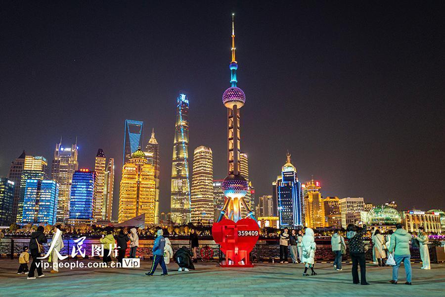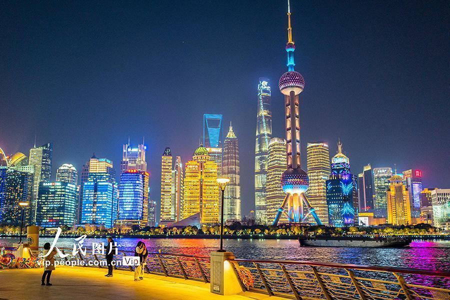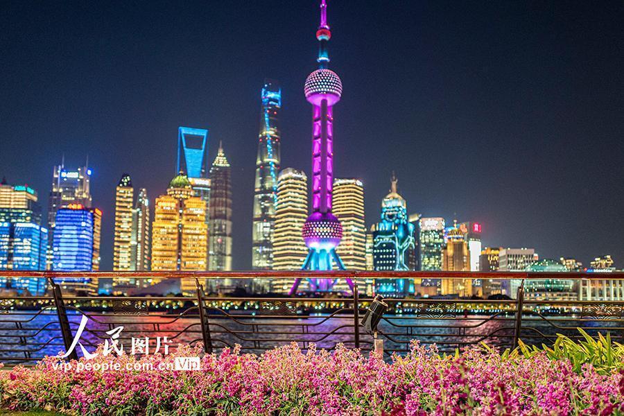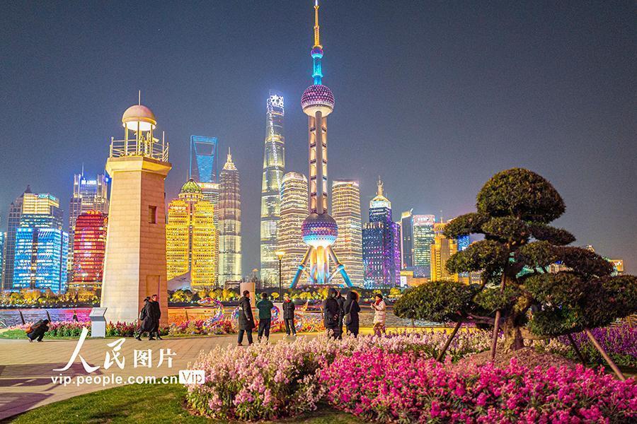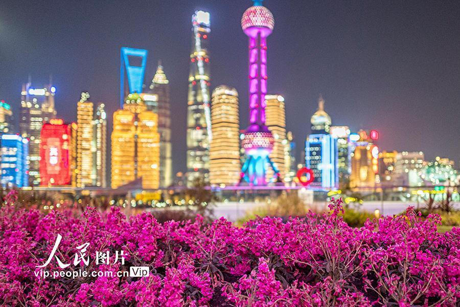 2025年2月10日,上海,游客在北外滩拍摄陆家嘴地标建筑群。2025年2月10日,上海,北外滩夜景璀璨,紫罗兰盛开,吸引游客纷至沓来。王初摄(人民图片网)